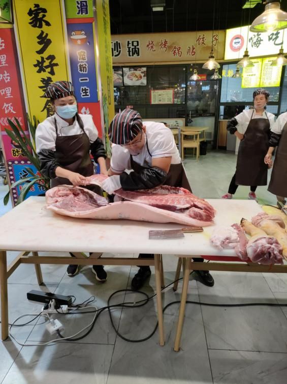 比賽開(kāi)始后,3組選手輪流開(kāi)始了分割豬肉項(xiàng)目。一片白條豬,基本在45公斤左右,但參賽選手們紛紛展現(xiàn)絕活。