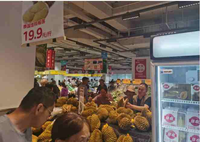 作為對比,在不細(xì)分等級情況下,同樣的泰國金枕榴蓮單品,龍商網(wǎng)&超市周刊實(shí)地探訪,永輝超市房山印象城店的售賣單價為28.9元/斤,這兩家超市的直線距離大概為3公里。