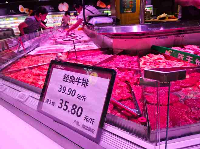 比如,襄陽好鄰居的鮮牛肉被顧客稱為“會跳舞的牛肉”,是因?yàn)槠洳少徶苯拥金B(yǎng)牛農(nóng)場選牛、屠宰廠現(xiàn)場宰殺、及時(shí)規(guī)范處理,分割好的鮮牛肉當(dāng)天就可以配送到店上架銷售,由于宰殺后不久,牛肉的肌肉、神經(jīng)還在機(jī)械性收縮,就會出現(xiàn)顧客在賣場看到的“會跳舞的牛肉”。